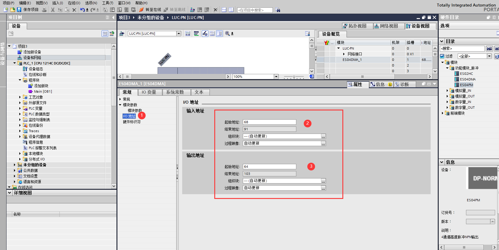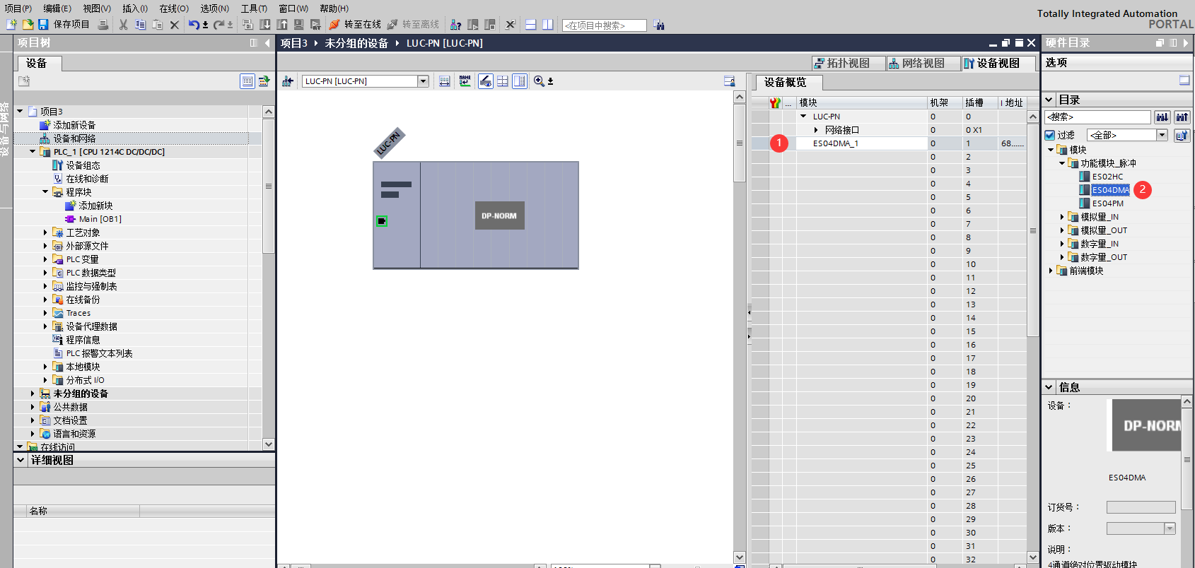 添加ES-04DMA硬件。雙擊后TIA Portal軟件右上角區域會出現LUC-PN擴展模塊的信息。先選中插槽1,再選擇“功能模塊_脈沖”再雙擊ES04DMA。