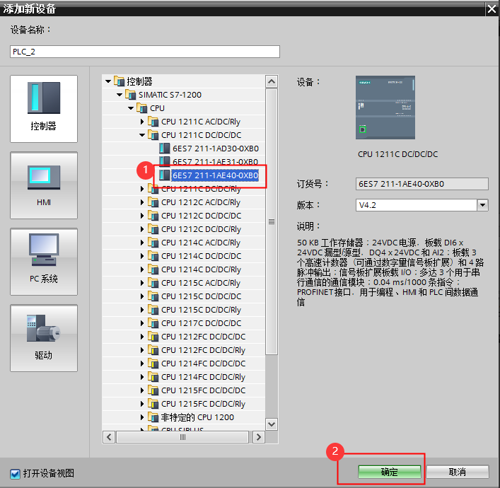 彈出“添加新設備” 窗口,進行“控制器/SIMATIC S7-1200/CPU→CPU 1211C DC/DC/DC→6ES7 211-1AE40-0XB0” 操作,點擊確定: